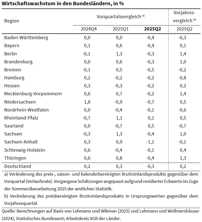 Den stärksten Rückgang verzeichnete Sachsen-Anhalt mit minus 1,1%, gefolgt von Niedersachsen (minus 0,7%) und Bremen (minus 0,5%). „Wegen der Unsicherheit bezüglich der US-Zollpolitik zu Jahresbeginn haben viele Unternehmen ihre Käufe ins erste Quartal vorgezogen“, sagt ifo Konjunkturexperte Robert Lehmann. „Diese Aktivitäten fehlten dann im zweiten Vierteljahr.“