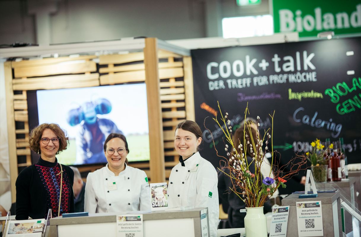 Am Messestand informiert Bioland zu mehr Nachhaltigkeit und Bio in der Profiküche und zur Belieferung von Großküchen mit heimischen Bio-Produkten.