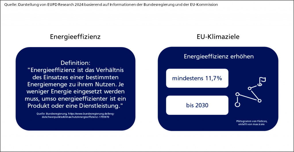Die EU hat sich bereits zu Klimazielen bis 2030 und 2050 verpflichtet. Anfang Februar präsentierte die EU-Kommission ein Etappenziel für 2040 (Quelle). Zu den Maßnahmen der EU zur Erreichung dieser Klimaziele gehört auch die Steigerung der Energieeffizienz (Quelle). So wurde in der Energieeffizienz-Richtlinie beschlossen, das Energieeffizienzziel bis 2030 um mindestens 11,7 Prozent im Vergleich zum Referenzszenario 2020 zu erhöhen (Quelle).
