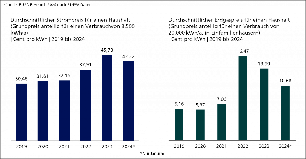 Der durchschnittliche Strompreis für Haushalte ist im Januar 2024 im Vergleich zu 2023 zwar leicht gesunken und beträgt nun durchschnittlich 42,22 ct/kWh (Quelle) , er liegt aber weiterhin deutlich über den Preisen der Jahre 2019 bis 2022. Auch der durchschnittliche Erdgaspreis für Haushalte ist im Januar 2024 gesunken und beträgt durchschnittlich 10,68 ct/kWh (Quelle). Auch hier ist der Durchschnittspreis jedoch auf einem deutlich höheren Niveau als in den Jahren 2019 bis 2021.